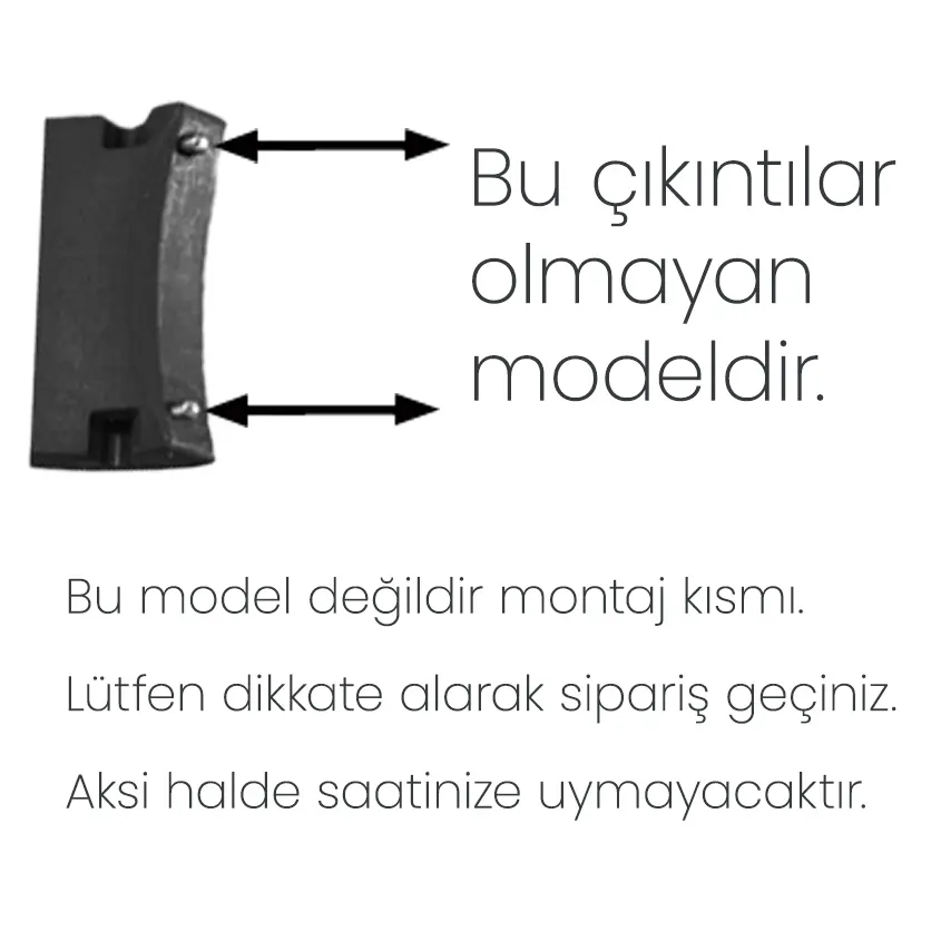 Kasa montaj kısmında küçük kordon entegre pimleri (dişi-erkek) olan model değildir. Lütfen saatinizin üzerindeki kordonun bu kısmını kontrol ederek doğruluğunu tespit ediniz ve sipariş geçiniz.